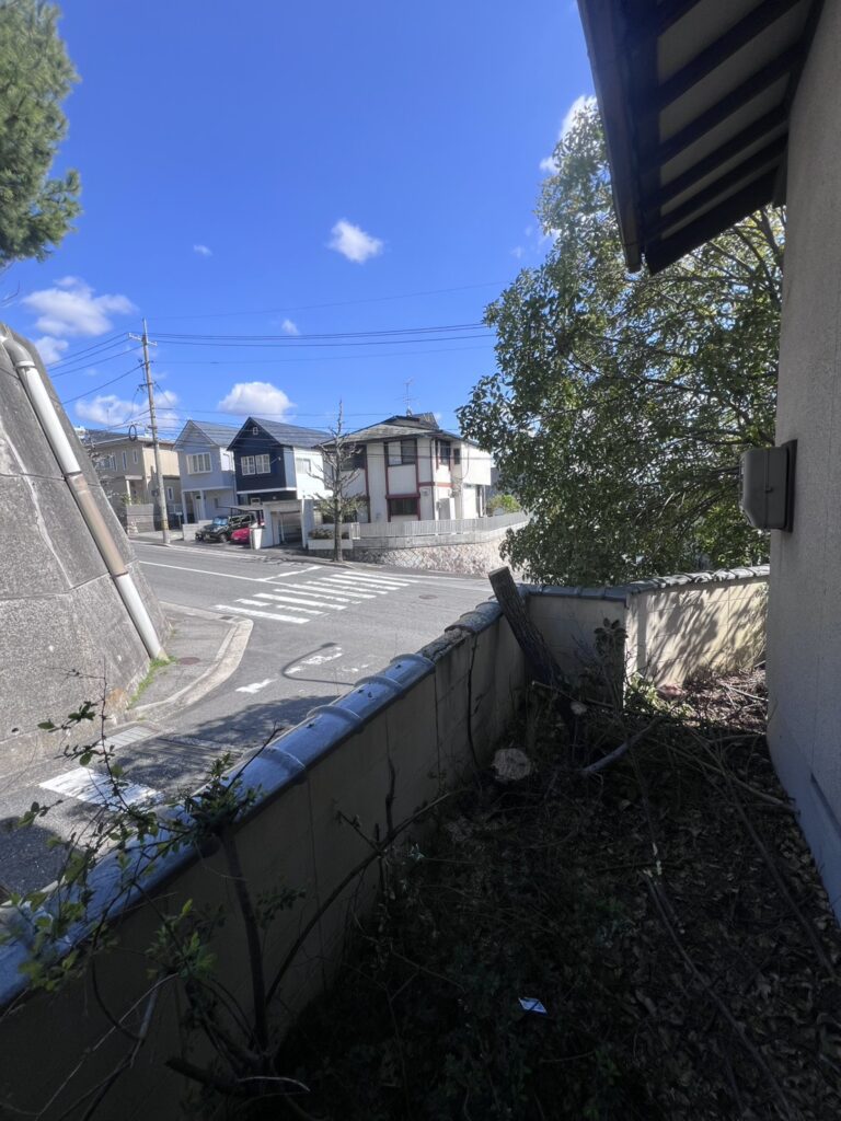 作業後は、道路側へ張り出していたグミの木がなくなり、敷地まわりがすっきりした印象になりました。枝葉による圧迫感もなくなり、道路側の見通しが良くなっています。