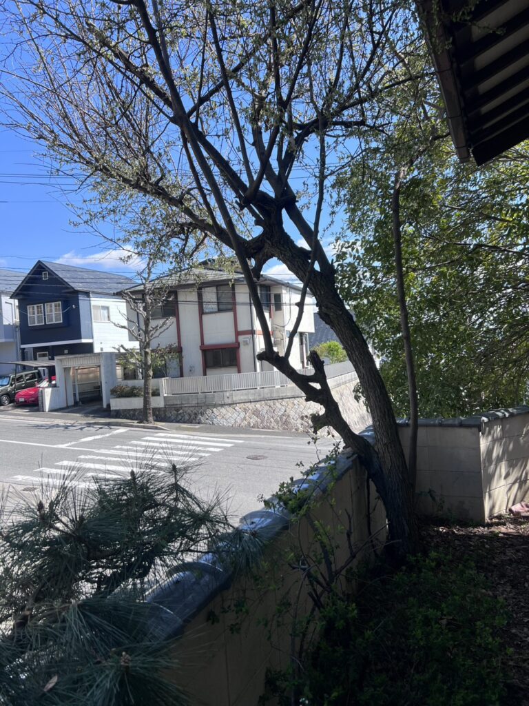 また、建物まわりの限られたスペースで管理を続けるのも負担になりやすく、早めの対応が必要な状態でした。そのため今回は、道路に出ている枝を整理する枝打ちとあわせて、木全体の伐採作業を行うことになりました。