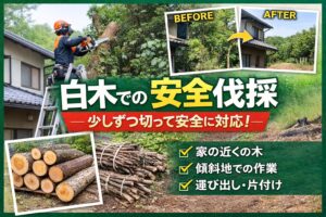 安佐北区白木で伐採作業|敷地際の樹木を段伐りで安全に伐採・搬出した作業実績